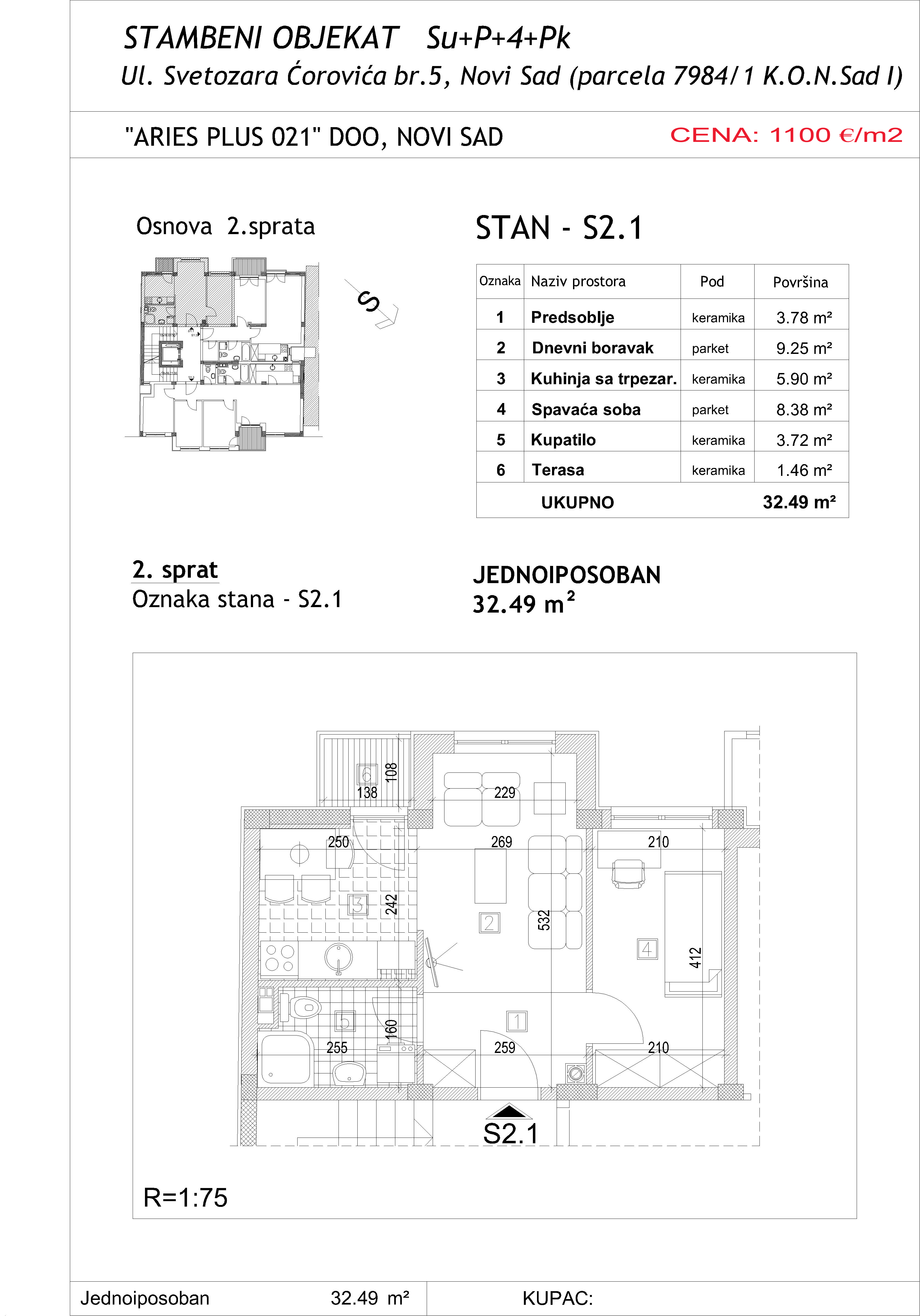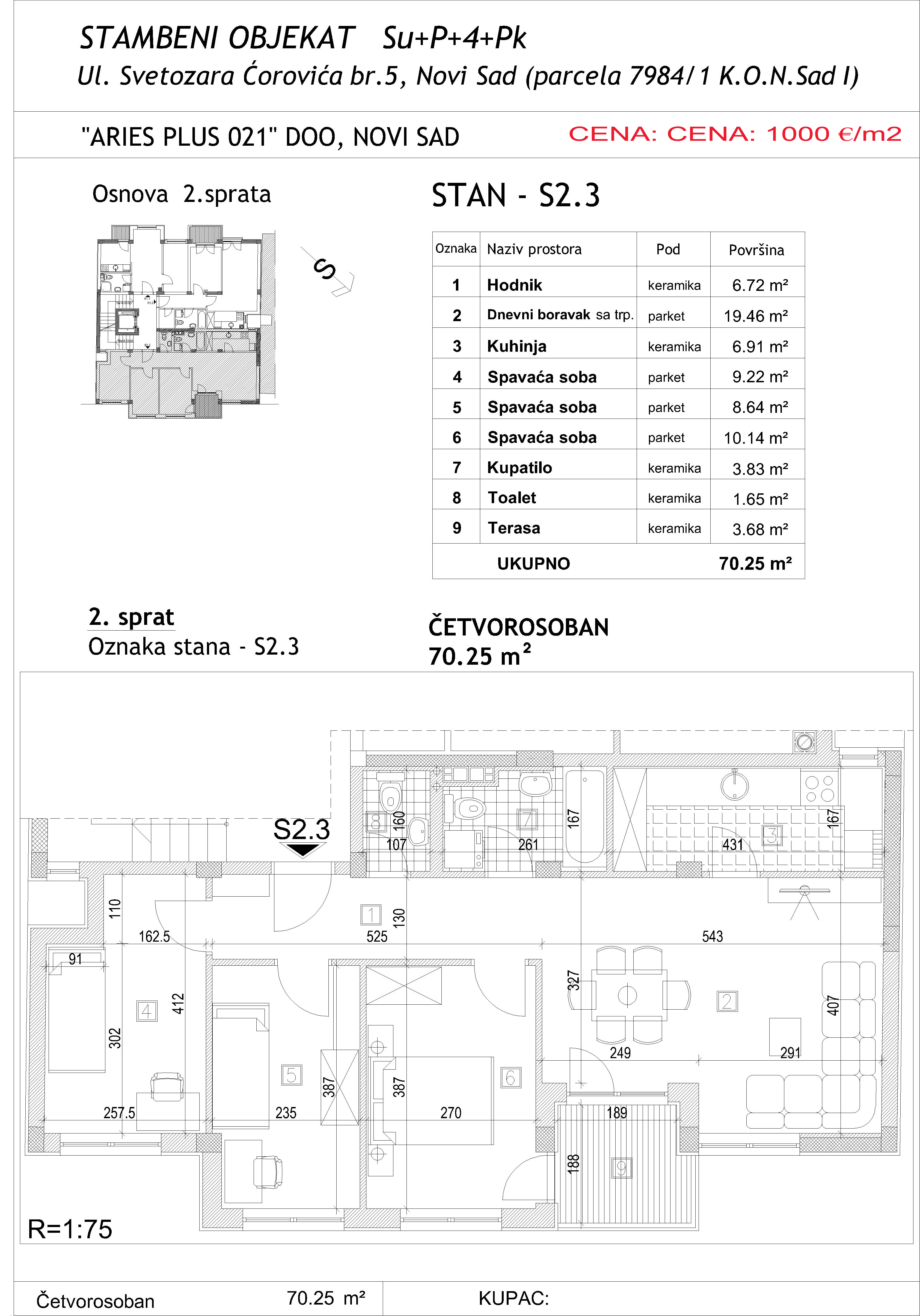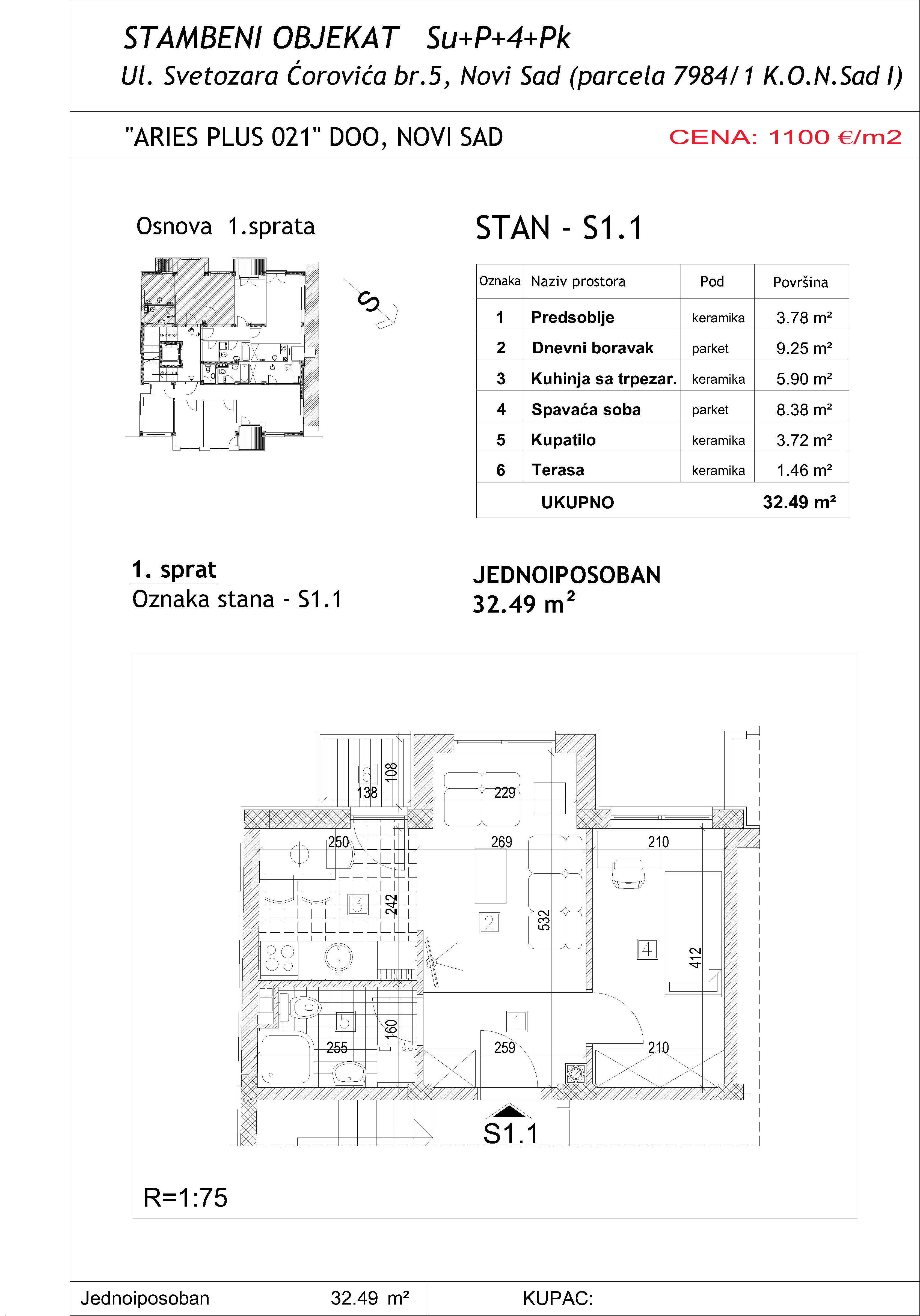 1. SPRAT: Na 1. Spratu su projektovane tri stambene jedinice različite struture od 32,49 – 70,25 m2. Svi stanovi imaju terase, a veći stanovi pored standardnih prostorija imaju ostave. Prepusti u vidu terasa i erkera na uličnom i dvorišnom delu fasade su 1,20m od građevinske linije prema datim urbanističkim uslovima.