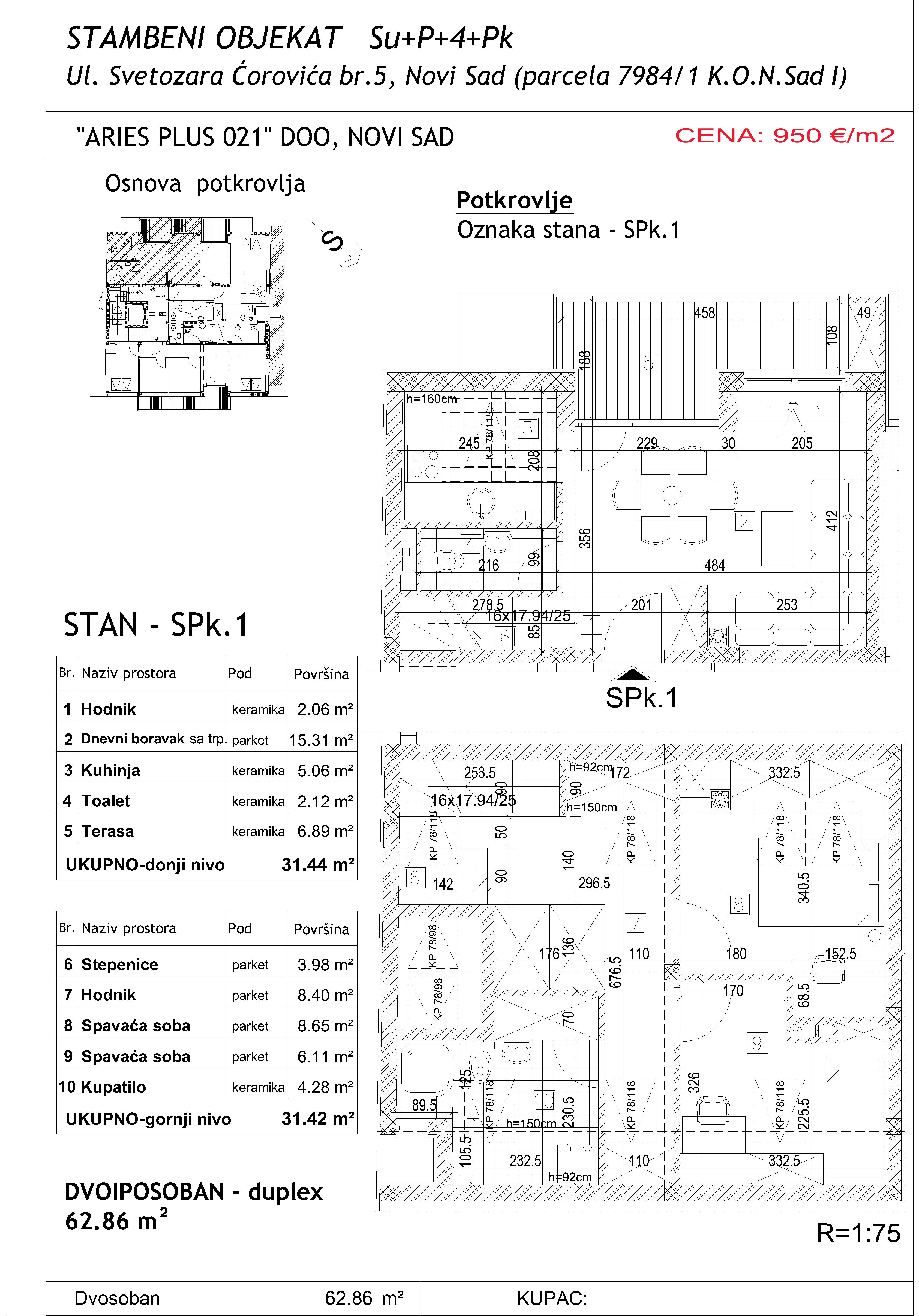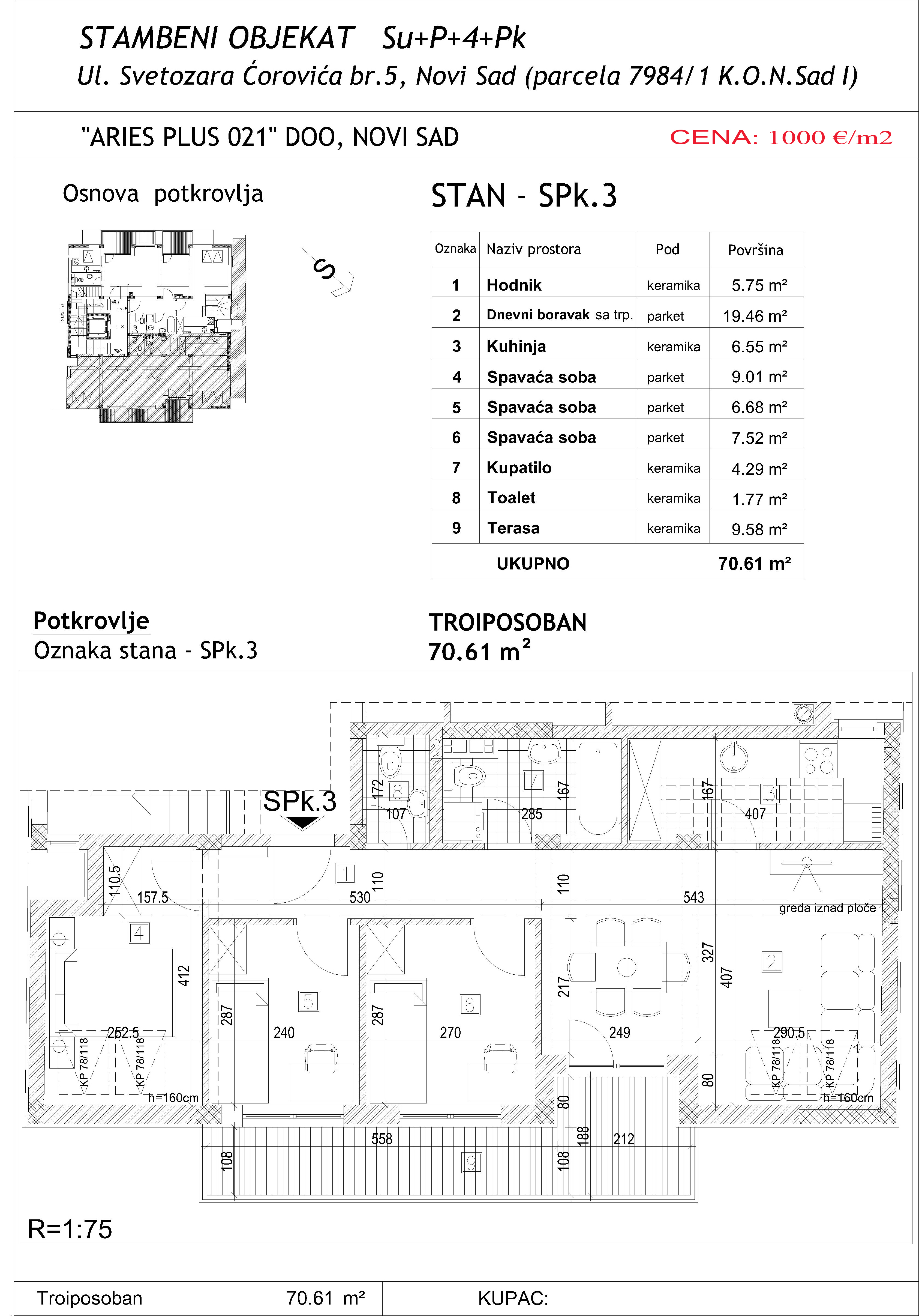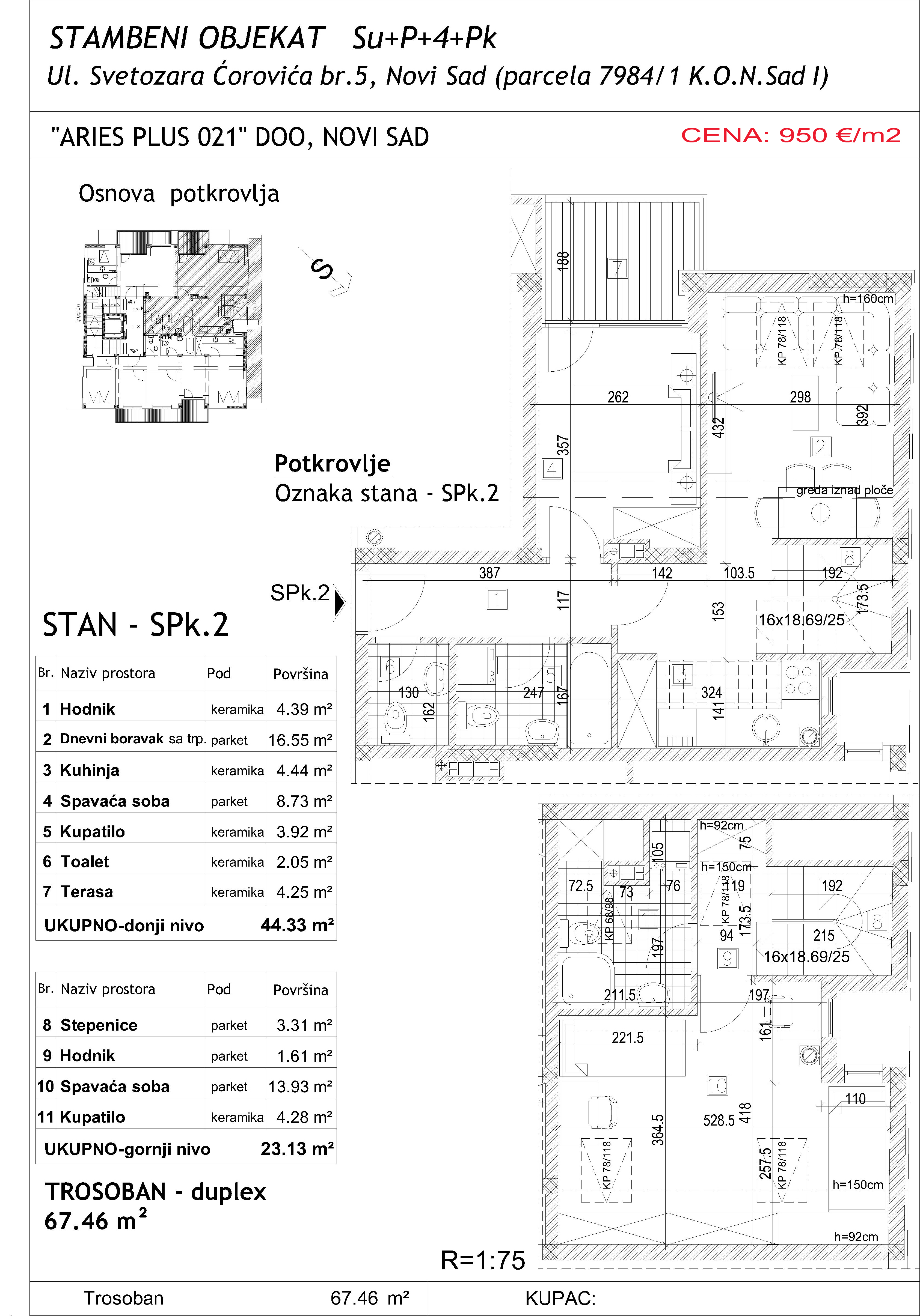 POTKROVLJE: U potkrovlju stambenog objekta projetovana su takođe 3 stana od 62,86 – 70,61 m2 od kojih su dva dupleksa.